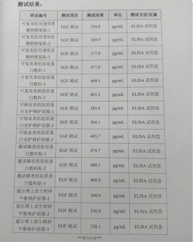 接到爆料后,大象新闻重新购买了秦女士使用的同款可复美产品以及11款其他不同品牌的产品送第三方检测机构进行检测。根据ELISA检测方法检测后,结果显示,除可复美产品检出EGF外,另外11款产品中有9款产品也都检测出了EGF,含量从354.8pg/ml-480.1pg/ml不等。