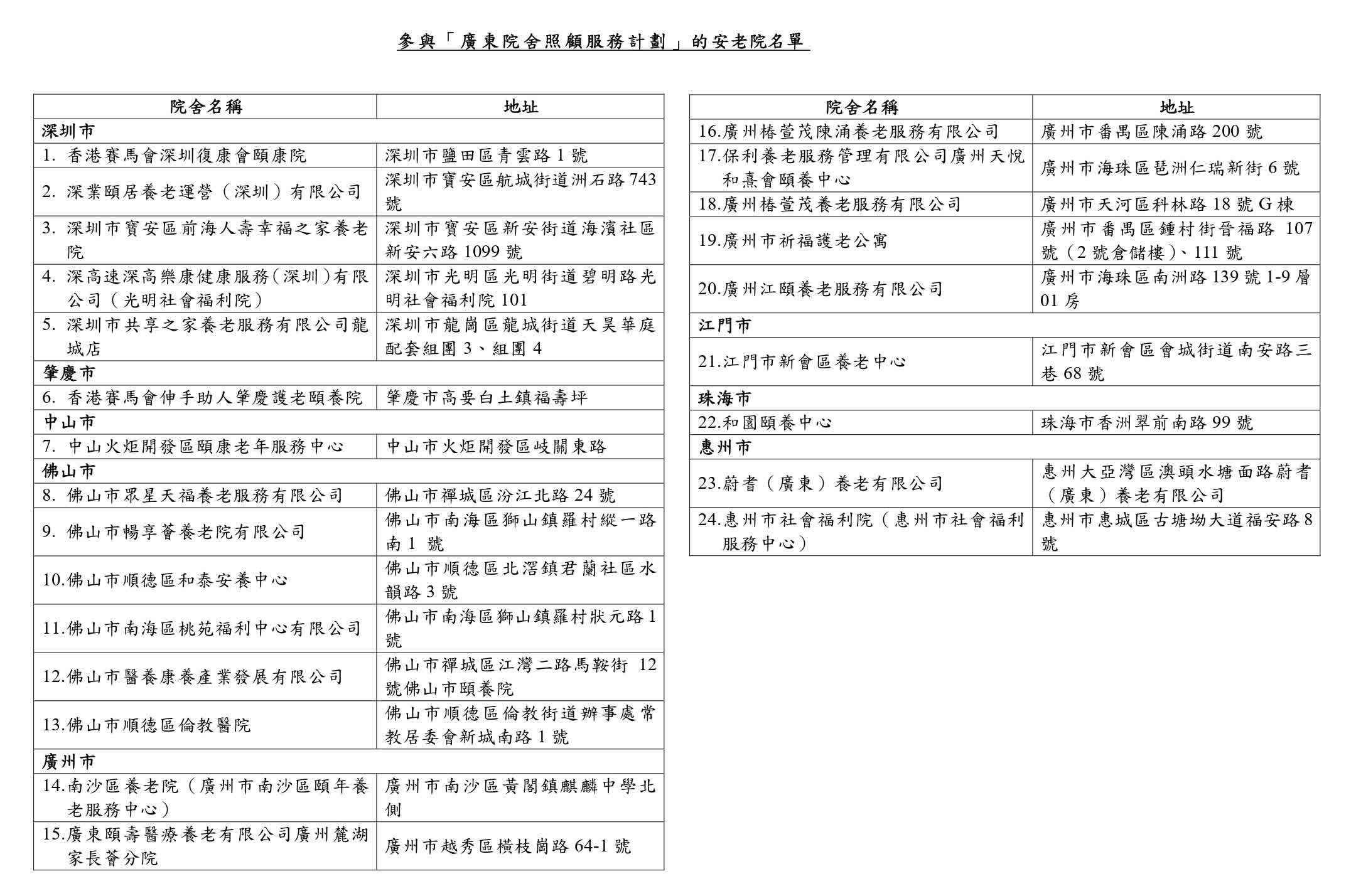 香港文匯報訊 《2024年施政報告》公布,政府將於2025年推出為期三年的試驗計劃,資助選擇赴粵養老的綜合社會保障援助 (綜援)受助長者入住指定在粵安老院,以改善生活環境和提升生活質素。政府今日(30日)公布,於明日(10月1日)起推出由關愛基金資助「綜合社會保障援助長者入住廣東院舍試驗計劃」(試驗計劃),為期3年,旨在提升生活質素,每名合資格長者每月可獲港幣5,000元資助,入住指定安老院(詳見下表),名額共1,000個。
