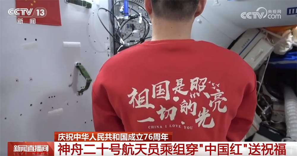 国庆佳节,中国空间站里的主色调是“中国红”,航天员们特意穿上了红色上衣,上衣上写的“祖国是照亮一切的光”,寓意着航天员们对祖国跨越星海的热爱与深情。航天员陈冬是第二次在太空欢度国庆节。