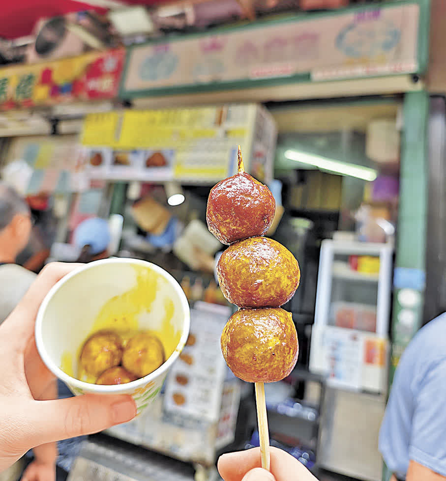 這間店舖與低調高手大街小食開在一條街,相隔不遠,食完香甜的雞蛋仔和格仔餅,來些鮮鹹小食中和味道。小食檔前貼了謝霆鋒、林俊傑、范振鋒等明星前來享用美食的相片,老闆娘推薦謝霆鋒最愛的無骨炸雞、咖喱魚蛋和煎釀三寶,不過慳妹還要留肚子食正餐,因而只點了10元的咖喱魚蛋嘗鮮。一份6粒,性價比算高,每一粒魚蛋上都淋上香濃的咖喱汁,口感彈牙爽口,好入味。不過店家只收現金和八達通,內地客來打卡記得提前準備現金。