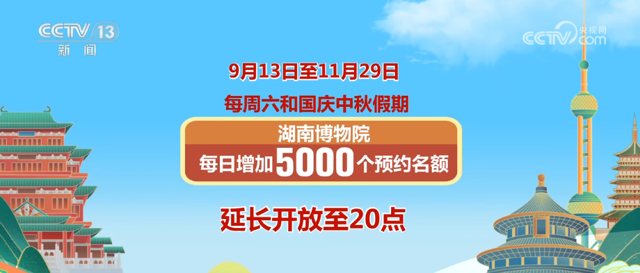 其中,湖南博物院9月13日至11月29日每周周六及国庆中秋假期,每日增加5000个预约名额,延长开放至晚上8时。