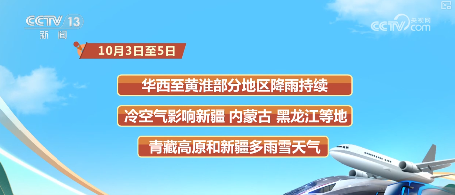 据中央气象台发布的消息,10月3日至5日,华西至黄淮一带部分地区降雨持续,冷空气影响我国新疆、内蒙古、黑龙江等地,青藏高原和新疆多雨雪天气。公安部交通管理局提醒广大驾驶人和出行群众,注意关注沿途及目的地气象部门预报预警信息。全国总体适航 部分机场可能受到风雨影响