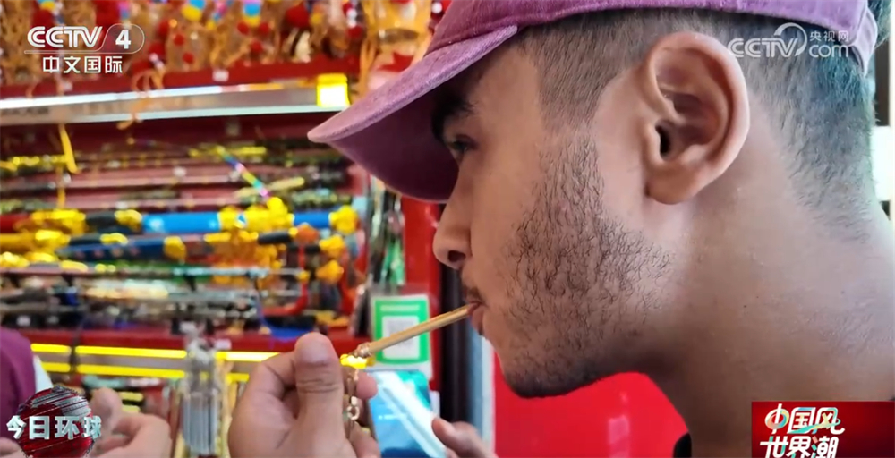 小摊老板称:“这叫口技,中国的传统文化,民间手工艺做的,叫口技,口技演员就这么来的,民间艺术。你试一下,吹一吹。”