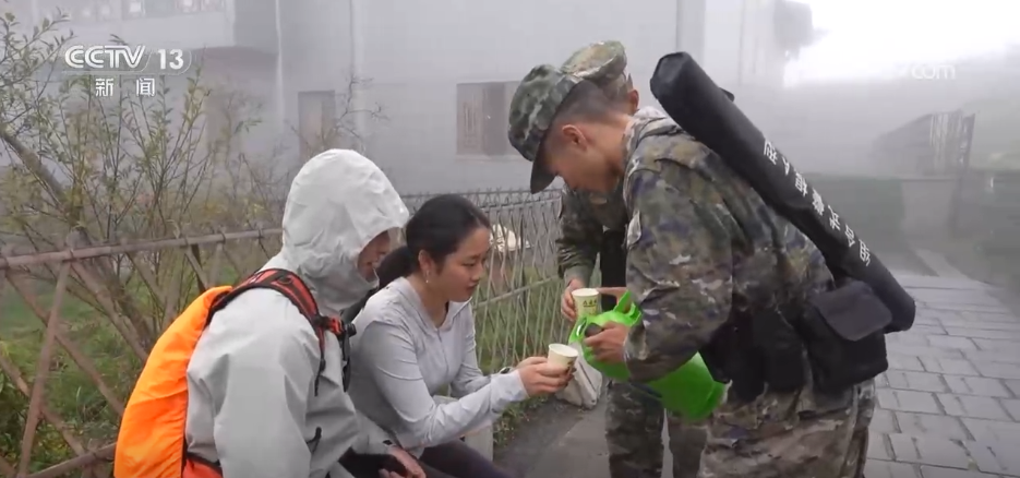 在金顶景区,武警官兵还派出巡逻小分队,携带开水壶、医药包等物品,为有需要的游客提供热水和氧气。