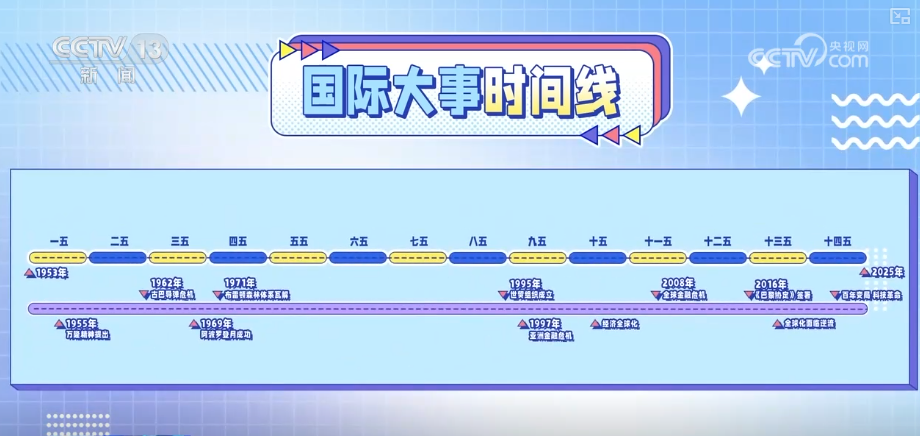 我们用数据和代码,梳理出了三条时间线,想从中看看,国家是怎样在“时间的棋局”中走出自己的节奏。第一条时间线,是把每一轮规划放在国际大事的坐标上。这样一比对就发现,中国的许多政策从来不是临时应对,而是提前布局。