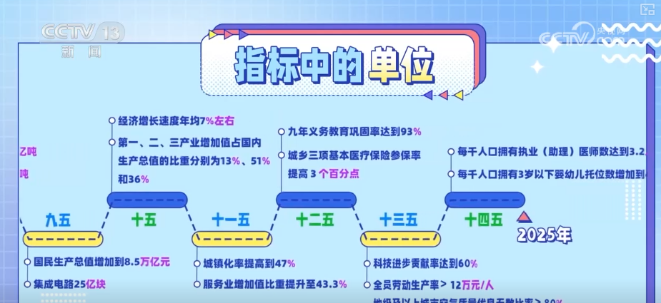 “一五”到“六五”阶段,目标多是绝对值;“十五”以后,指标里出现了大量强调结构优化的“比率”和“占比”;而到“十三五”“十四五”时期,目标转向了创新、绿色、效率等综合性指标,比如“科技进步贡献率”“全员劳动生产率”“空气质量”等。“十四五”规划还新增了“每千人口拥有执业(助理)医师数”“每千人口拥有3岁以下婴幼儿托位数”等民生福祉指标。国家发展的重点从单纯追求经济增长,转向更加注重社会公平、人民的生活质量和可持续的发展。