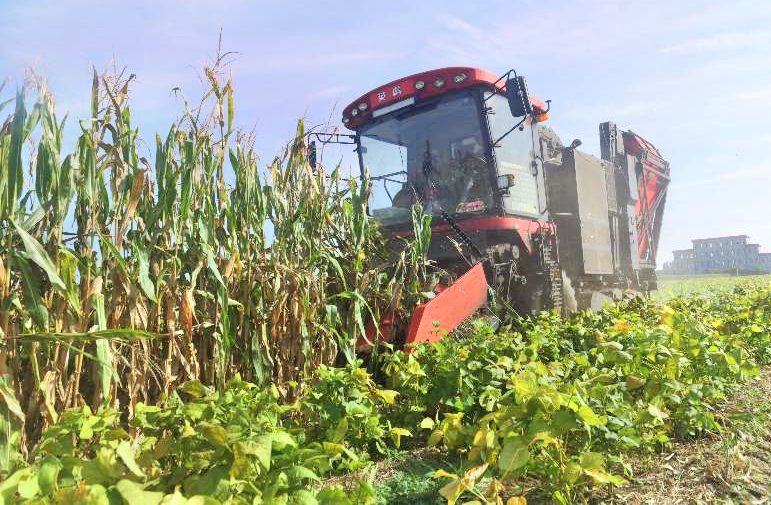 14日,在河北省石家庄新乐市东名村农田,农民驾驶农机收获玉米。贾敏杰 摄