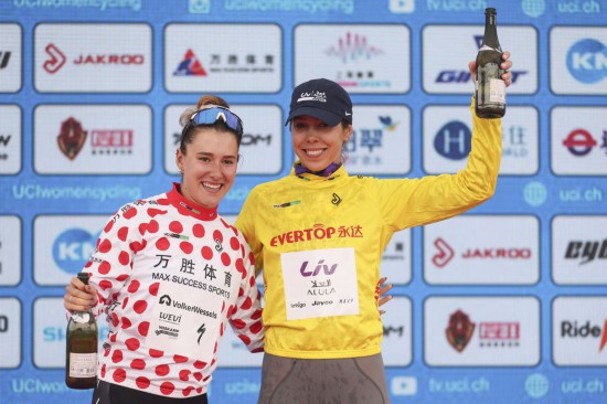 10月14日,身着代表爬坡总积分第一名的圆点衫的安妮·克妮珍宝(左)和身着代表个人总成绩第一名的黄衫的贝克在颁奖仪式上庆祝。新华社记者 王翔 摄