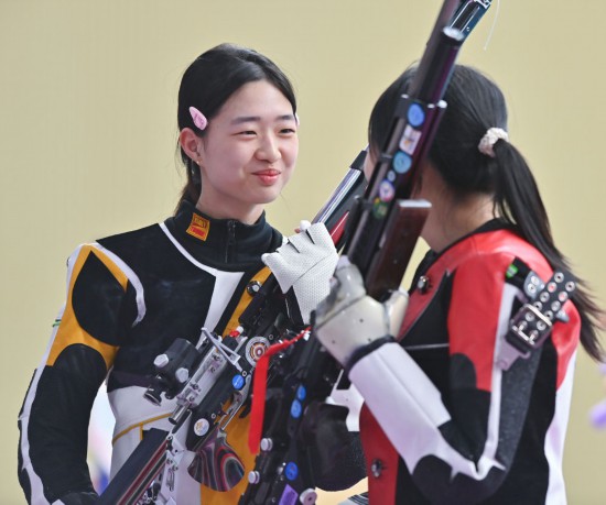 10月14日,浙江队选手黄雨婷(左)与队友王子菲在第十五届全运会女子10米气步枪团体决赛后。新华社记者 肖恩楠 摄