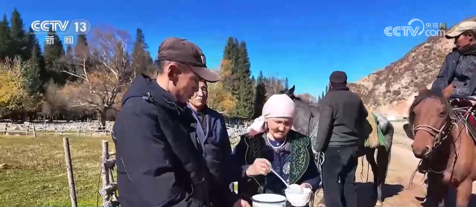赶着羊群一路向西,赛力克阿力一行要经过喀拉峻草原、库尔代峡谷、库尔代河才能到达第一个服务点。沿途秋意正浓,经过一些村庄和牧民定居点时,相识不相识的牧民都会送上自家酿制的酸奶,让转场路多了几分暖意。七、八个小时后,赛力克阿力一行终于到达第一个转场服务点,450只羊一只也不少。