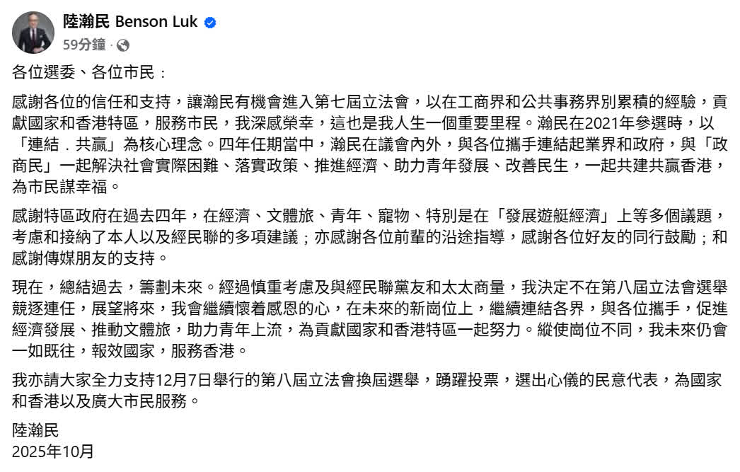 香港文匯網訊 10月27日,立法會選委界議員陸瀚民在社交平台發文宣布,經過慎重考慮,並與經民聯黨友和太太商量後作出決定,不在第八屆立法會選舉競逐連任。