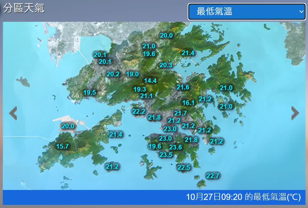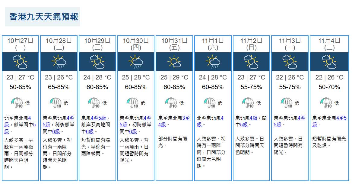 展望明日(星期二)天氣,大致多雲,初時有一兩陣雨,日間部分時間天色明朗,氣溫介乎23至26度。星期三重陽節(29日)短暫時間有陽光,早晚有一兩陣微雨,氣溫介乎24至28度。