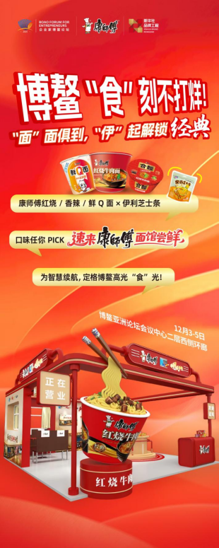当全球智慧汇聚博鳌,当经典美味碰撞思想火花,康师傅“红烧牛肉面・国民经典时光馆”已备好三十年沉淀的味觉盛宴。12月3日至5日,博鳌亚洲论坛会议中心二层西侧环廊,诚邀各位参会嘉宾驻足品鉴,在忙碌的论坛日程中,感受国民美食的温暖力量,共话经典与未来的无限可能!
