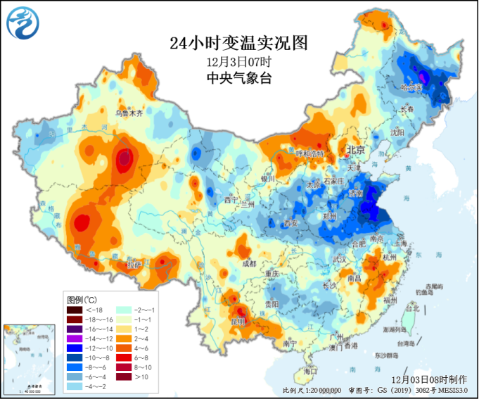 中国网12月3日讯 据中央气象台消息,随着寒潮主体进一步东移南下,过去一天我国中东部地区气温持续下跌。最新气象监测显示,3日早晨,山东、河南、江苏、安徽一带气温下降幅度达到4~8℃,局地降幅超过10℃,最低气温0℃线位于苏皖北部、河南南部至陕西南部等地。