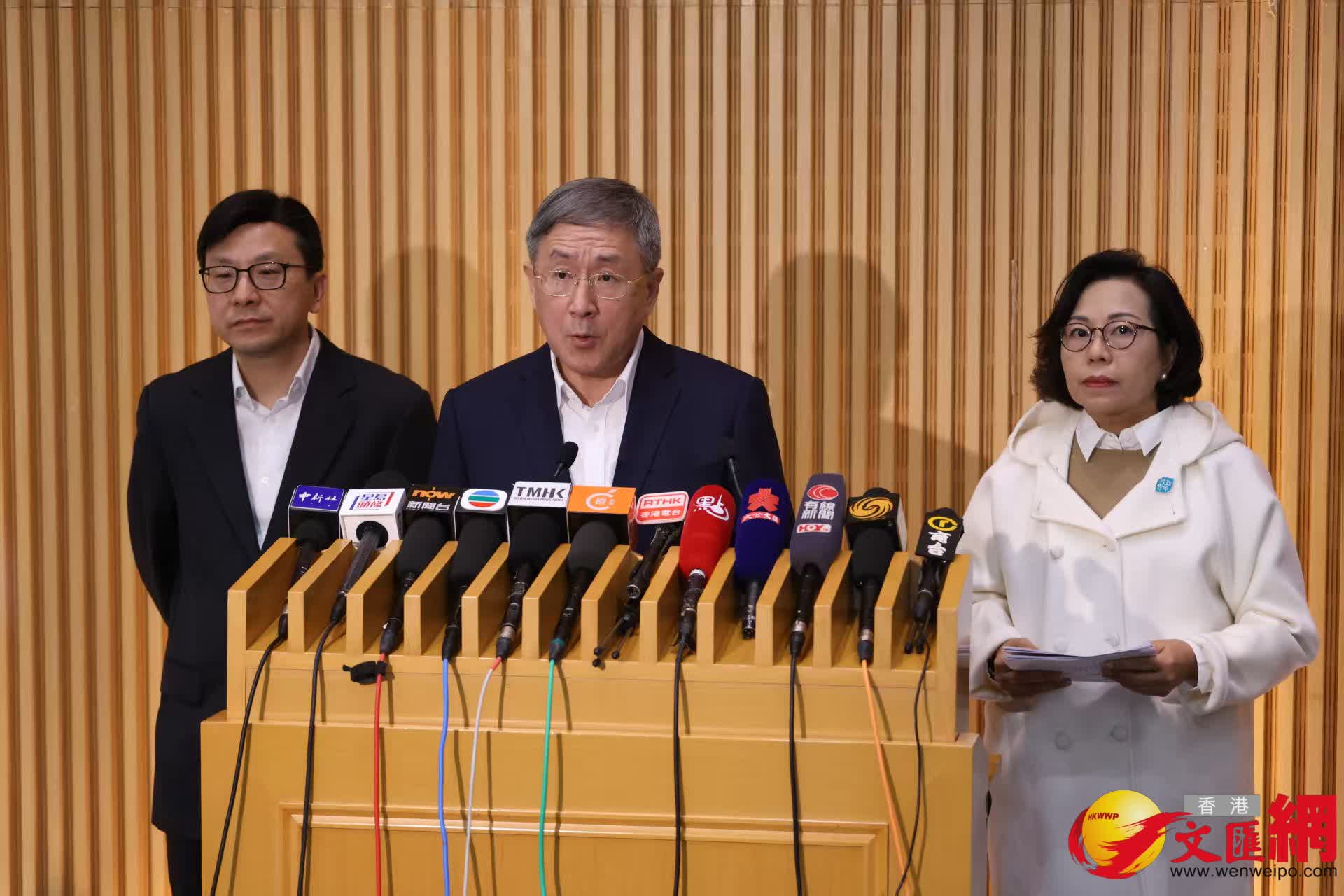 政務司副司長卓永興(中)、民政及青年事務局局長麥美娟(右)和勞工及福利局局長孫玉菡就大埔宏福苑援助基金會見傳媒。香港文匯報記者黃艾力攝