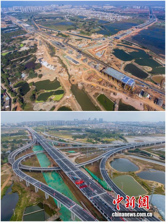 2025年12月18日,海南自由贸易港正式启动全岛封关。近年来,海南自贸港建设在利好政策带动下不断刷新“自贸港速度”,一个个重大项目、重点园区拔地而起,直观呈现海南自贸港的蓬勃生机。这里正成为中国对外开放的新前沿、互利合作的新热土和推动经济全球化的新引擎。上资料图为2021年2月6日正在建设中的G15沈海高速公路海口段项目海秀互通,下资料图为2022年12月28日G15沈海高速公路海口段建成通车。(拼版图,无人机照片)