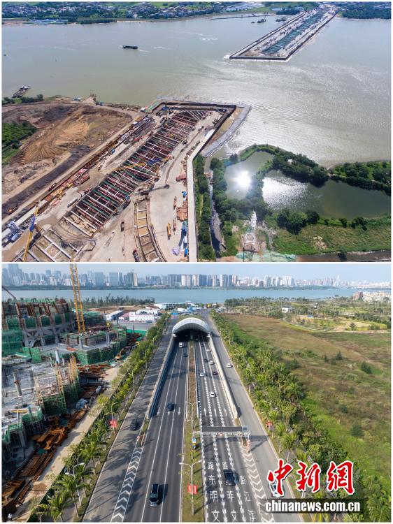 2025年12月18日,海南自由贸易港正式启动全岛封关。近年来,海南自贸港建设在利好政策带动下不断刷新“自贸港速度”,一个个重大项目、重点园区拔地而起,直观呈现海南自贸港的蓬勃生机。这里正成为中国对外开放的新前沿、互利合作的新热土和推动经济全球化的新引擎。上资料图为2019年6月19日的海口文明东越江隧道施工现场,下资料图为2025年12月7日已建成通车的海南省首条跨越南渡江隧道——文明东隧道。(拼版图,无人机照片)