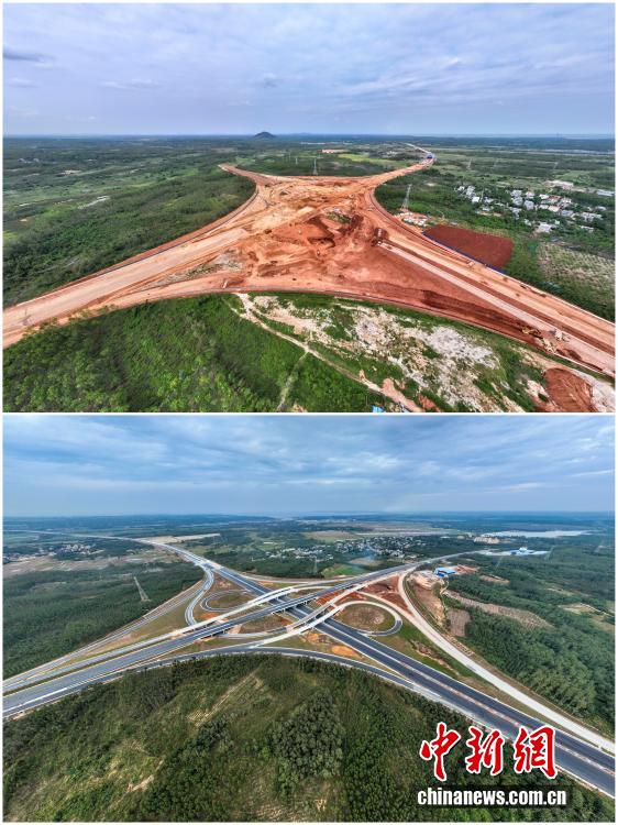 2025年12月18日,海南自由贸易港正式启动全岛封关。近年来,海南自贸港建设在利好政策带动下不断刷新“自贸港速度”,一个个重大项目、重点园区拔地而起,直观呈现海南自贸港的蓬勃生机。这里正成为中国对外开放的新前沿、互利合作的新热土和推动经济全球化的新引擎。上资料图为2024年10月23日建设中的海南首条双向八车道高速公路——海南洋浦疏港高速公路SG01标段光村互通,下资料图为2025年12月2日正进行沥青摊铺作业的海南洋浦疏港高速公路光村互通。(拼版图,无人机照片)