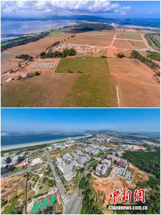 2025年12月18日,海南自由贸易港正式启动全岛封关。近年来,海南自贸港建设在利好政策带动下不断刷新“自贸港速度”,一个个重大项目、重点园区拔地而起,直观呈现海南自贸港的蓬勃生机。这里正成为中国对外开放的新前沿、互利合作的新热土和推动经济全球化的新引擎。上资料图为2020年6月18日俯瞰尚未开发的海南陵水黎安国际教育创新试验区所在地,下资料图为2025年11月22日已初具规模的海南陵水黎安国际教育创新试验区。(拼版图,无人机照片)