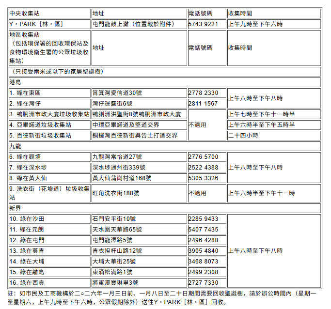 為鼓勵社會各界回收及循環再造園林棄置物,環境保護署(環保署)今日(12月19日)呼籲市民及工商機構透過2025-26天然聖誕樹回收計劃,回收擬棄置的天然聖誕樹(聖誕樹)。所收集到的聖誕樹會在Y·PARK[林·區]轉化成不同再生產品,例如種植及園藝用的覆蓋物和木槺等。有關計劃安排如下: