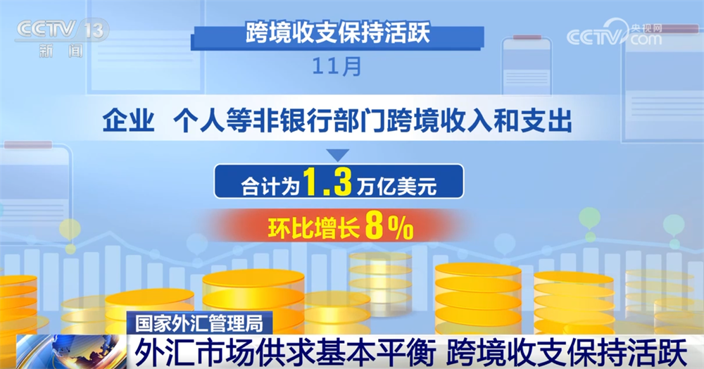 外汇市场供求延续基本平衡。11月,银行结汇和售汇规模均保持稳定,结售汇顺差157亿美元,与10月基本相当。