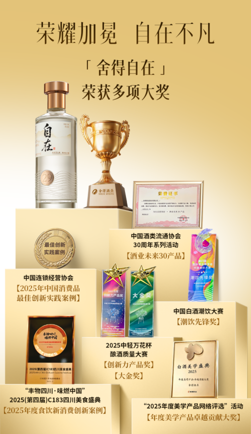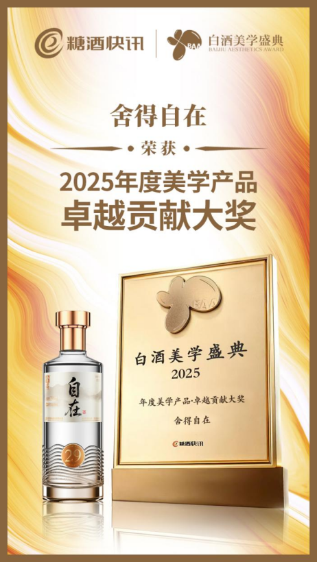 市场与行业也对舍得自在给予高度认可。11月20日,产品获中国轻工业联合会颁发的“2025中轻万花杯酿酒质量大赛大金奖”与“创新力产品奖”,彰显其卓越酒体品质。此前,在由糖酒快讯联合多家机构共同发起的“2025年度美学产品网络评选”中,舍得自在摘得“2025年度美学产品卓越贡献大奖”,体现了其在酒体品质、包装设计和文化表达上的全方位美学升级,为白酒行业发展注入了新活力与想象空间。