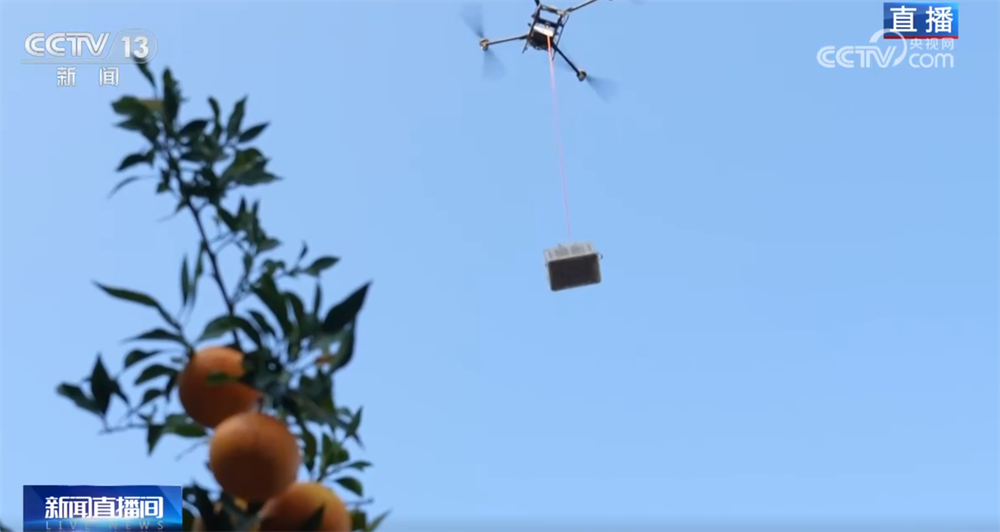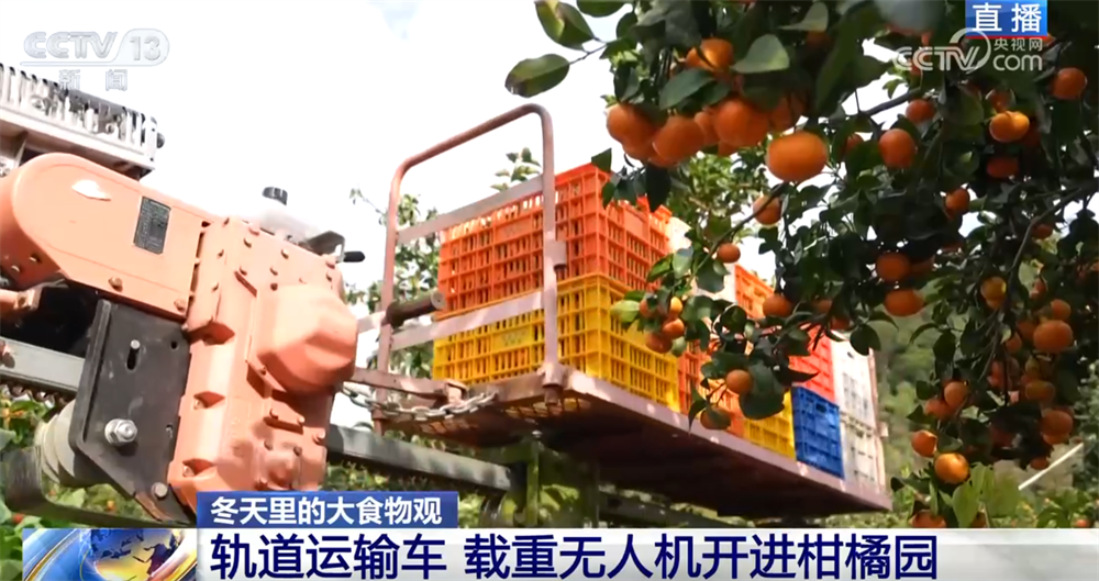 不仅采摘有技巧,运输也用上了新工具。今年果农们引入了大型载重无人机,一次可以吊运100公斤左右的鲜果,运输效率比过去肩挑背扛提升了7倍,特别适合这种地处偏远、交通不便的果园。而地面上也建设了3公里的轨道,轨道运输车可以做到“上山拉肥料,下山拉柑橘”,大大降低了运输成本。