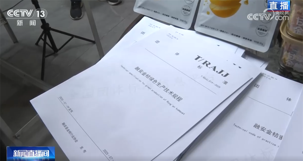 同时我们也了解到,融安金桔不仅是一颗有历史的金桔,同时也是一颗有标准的金桔。目前当地已经针对全产业链建立了36项团体标准,涵盖金桔的种质保护、生产加工等各个环节。比如我手上这本《融安金桔绿色产品生产技术规程》,对融安金桔种植管理的物理防治、生草栽培、通风透光等等都作出了明确的规定,要求当地种植基地和农户落实绿色标准和要求。这样保证了融安金桔不仅畅销国内各大中城市,更远销加拿大、新加坡、阿联酋等多个国家,以卓越品质赢得海内外消费者的广泛青睐。预计2025至2026年金桔季,融安金桔全产业链产值近100亿元。