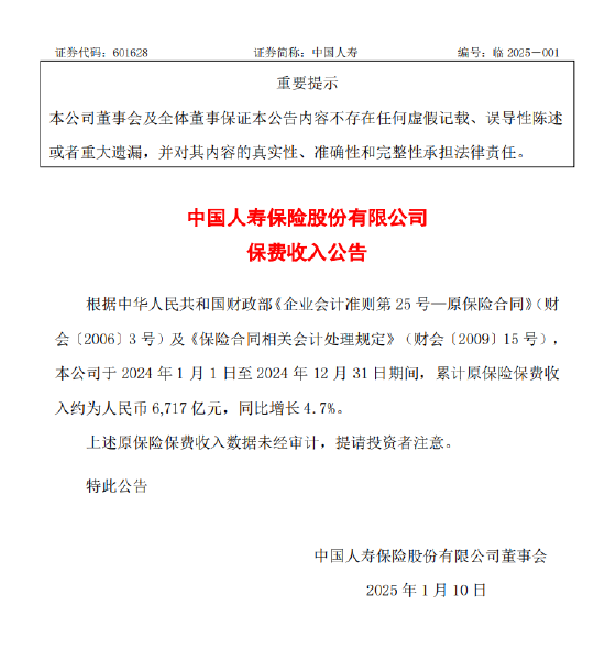 1月10日金融一线消息,中国人寿发布公告称,公司于2024年1月1日至2024年12月31日期间,累计原保险保费收入约为人民币6717亿元,同比增长4.7%。