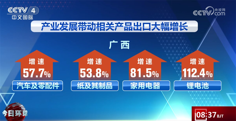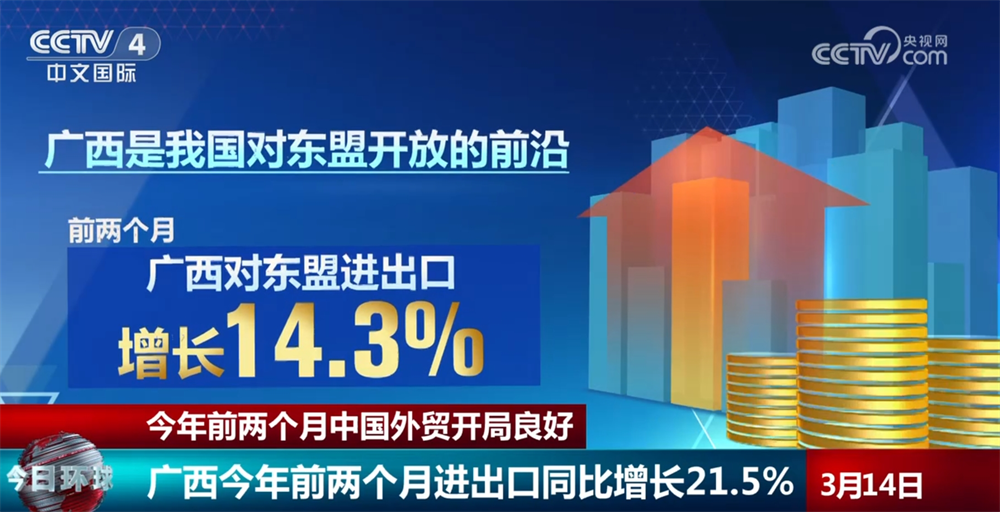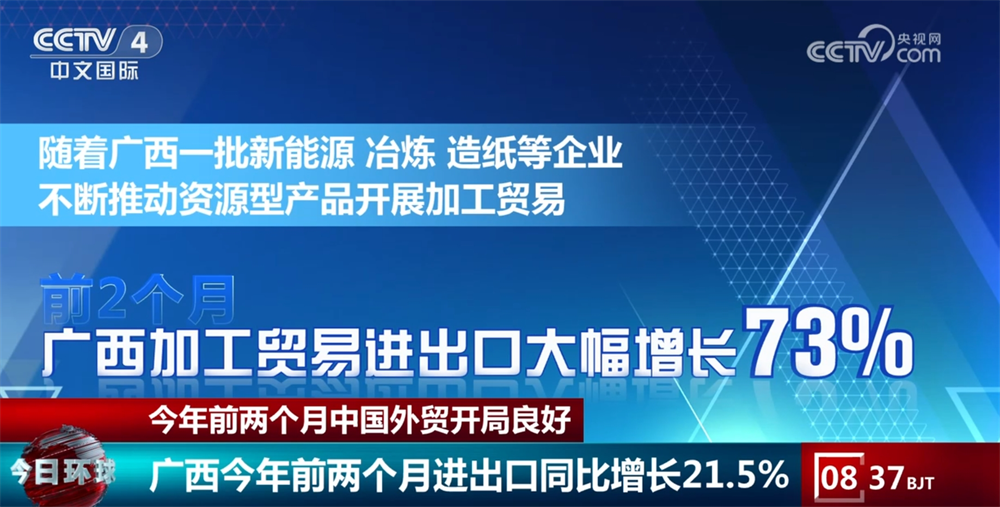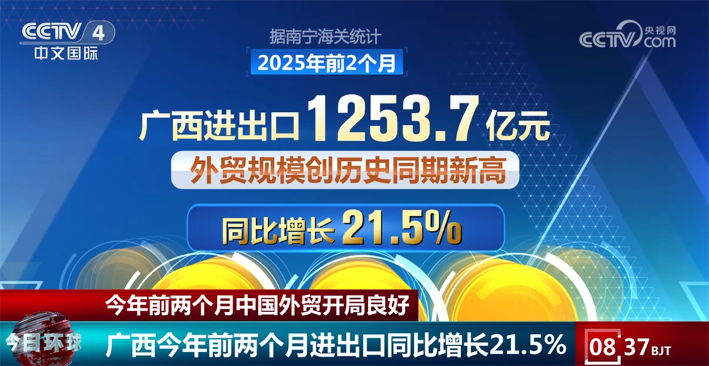 Guangxi is the forefront of my country's opening up to ASEAN. In the first two months, Guangxi's imports and exports to ASEAN increased by 14.3%. According to statistics from Nanning Customs, in the first two months of 2025, Guangxi's imports and exports reached 125.37 billion yuan, the scale of foreign trade hit a record high in the same period, an increase of 21.5% year-on-year. As a number of new energy, smelting, papermaking and other enterprises in Guangxi continue to promote processing trade in resource-based products, Guangxi's processing trade imports and exports increased significantly by 73% in the first two months. In addition, industrial development has driven a significant increase in exports of related products, and Guangxi's exports of automobiles and spare parts, paper and their products, household appliances and lithium batteries have increased significantly, with growth rates reaching 57.7%, 53.8%, 81.5% and 112.4% respectively.