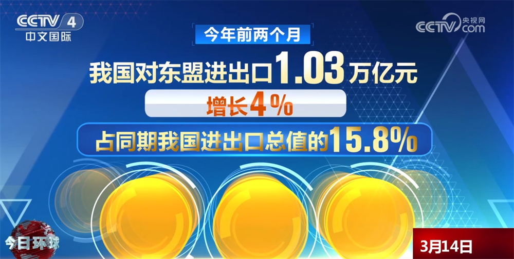 According to customs statistics, my country's imports and exports to ASEAN in the first two months of this year were 1.03 trillion yuan, an increase of 4%, accounting for 15.8% of my country's total import and export value during the same period.