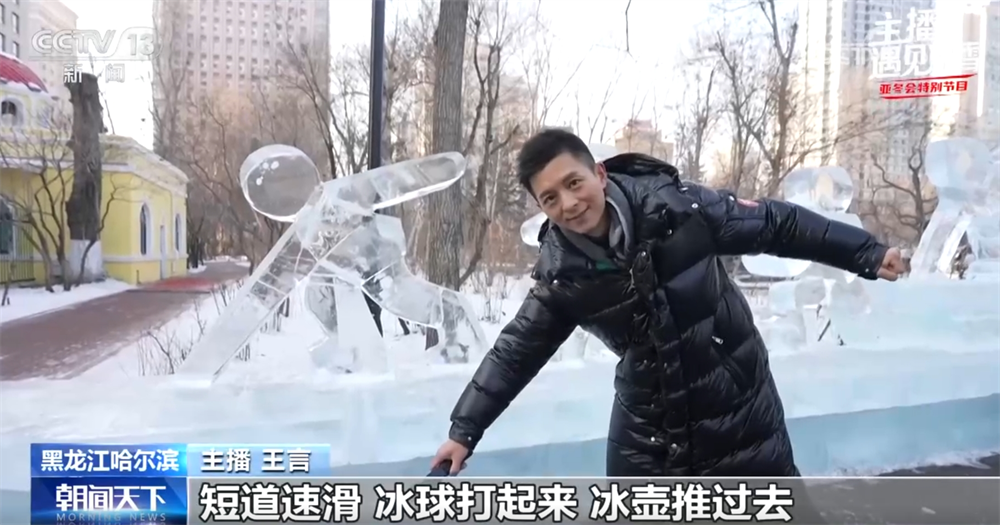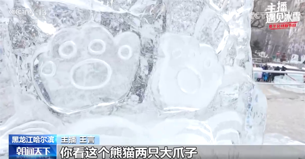 王言:看我在哈尔滨的兆麟公园里看见啥?看见我老家了,看见熊猫了,冰凝熊猫运。你看这个熊猫两只大爪子。