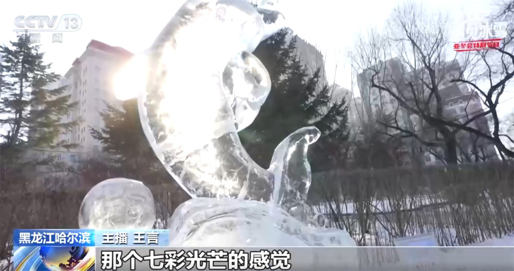 王言:来吧,我们跟着小朋友们一起去逛公园,短道速滑冰球打起来,冰壶推过去。看到这种冰雕就是莫名想去舔一口。大家来看这个冰雕,在这个阳光的照耀下,晶莹剔透的这个质感,而且里面好像隐隐能看出那个七彩光芒的感觉。