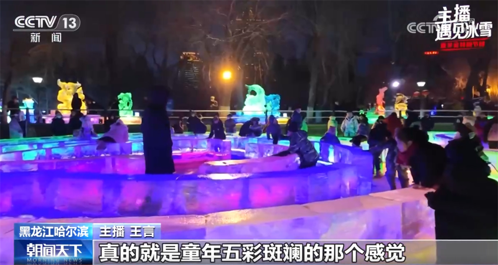 王言:华灯一上,这个兆麟公园的气质马上就不一样了,白天的关键词是晶莹剔透,晚上大家看就是美轮美奂,而且除了有精美的冰雕,还有好多好玩的。走,我们先去玩冰迷宫。我打着灯笼肯定不会迷路,这边出不去,得走这边。这个冰迷宫最大的特点是它可以滑着走。快到这一层了,然后那边没路了,我们得往里边走了。这个灯光的色彩真的就是童年五彩斑斓的那个感觉。小朋友在这里享受童年,大朋友在这里像我一样回味童年。你们是从哪儿来的?