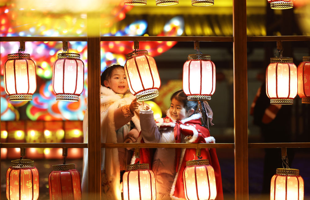 2025年1月31日晚,在山东省临沂市郯城县郯国古城景区,两名穿着传统服饰的小女孩在观赏花灯。新华社发(张春雷 摄)