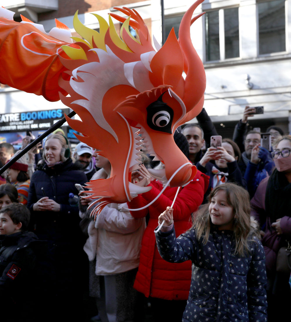 2025年2月2日,一名女孩在英国伦敦举行的新春巡游活动上与“中国龙”互动。新华社记者 李颖 摄