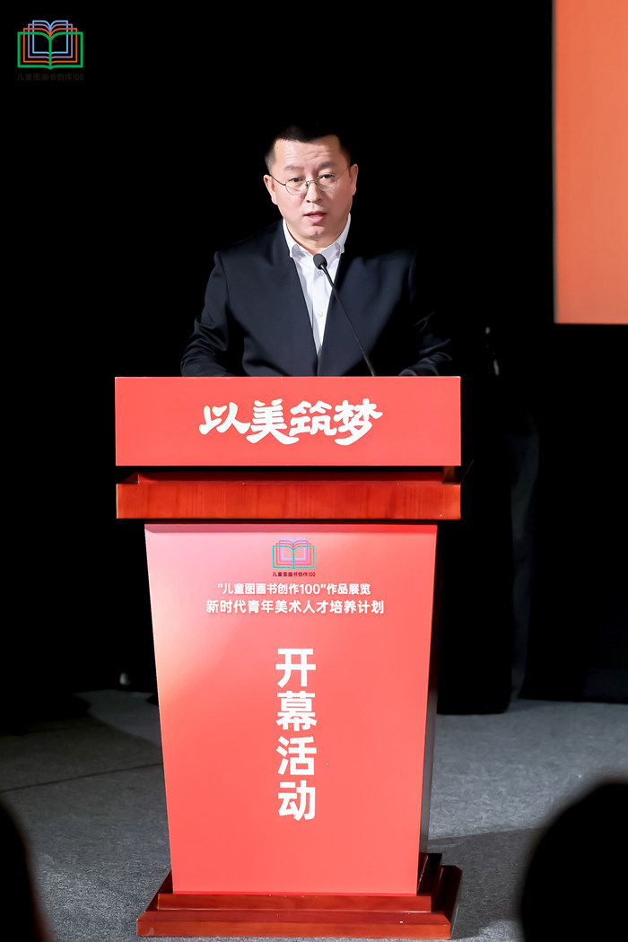 中国美术家协会分党组书记、驻会副主席、秘书长马锋辉在开幕式致辞中指出,“儿童图画书创作100项目”是美术界学习贯彻习近平文化思想特别是贯彻落实习近平总书记关于美育工作重要指示精神的具体举措。习近平总书记在给中央美术学院8位老教授的回信中指出,做好美育工作,要坚持立德树人,扎根时代生活,遵循美育特点,弘扬中华美育精神,让祖国下一代身心都健康成长。近年来,中国美协进行广泛调研、精心谋划,决定启动新时代青年美术人才培养计划,先期实施的“儿童图画书创作100”项目,就是要培养一批青年儿童图画书作者,提升原创中国儿童图画书的创作水平与出版质量。我们衷心希望通过这次展览,能激励更多青年美术家参与、从事原创儿童图画书创作中去,通过美的传播,启发少年儿童感知中国文化,增强爱国情感,培育社会主义核心价值观,让他们在昂扬向上、乐观健康的审美世界中健康成长。同时,他认为此次展览的举办、图画书作品的结集出版以及后续艺术衍生品研发等一系列活动,将会对提升原创中国儿童图画书的影响力和覆盖面产生积极的作用。这不仅有助于提高我国儿童图画书的知名度和市场份额,还能为相关产业链带来新的发展机遇,推动文化产业的繁荣。他表示中国美协也将以此项目为抓手,形成长效扶持、培养和激励机制。持续推进优秀原创儿童图画书的创作,力争推出更多具有中国特色、中国风格、中国气派的儿童读物,为扎实推进文化强国和中华民族现代文明建设作出新的贡献。