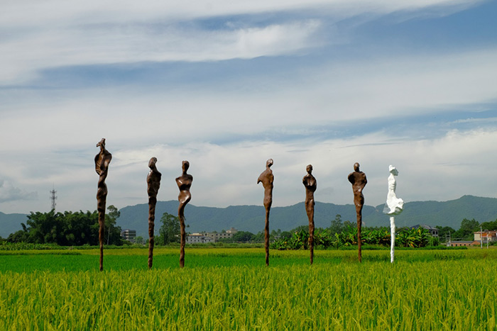 本届艺术季还有一位特殊身份的艺术家,他就是知名演员、跨界艺术家黄渤。他为本次艺术季带来了《畴生》,作品伫立在稻田中,由七座拉长的抽象人形雕塑组成,其姿态宛若自田畴生长而出。作品以“畴”寓意土地与长寿之乡,以“生”指向生命与繁衍,抽象人形如图腾般矗立,呈现人与土地共生共荣的关系。