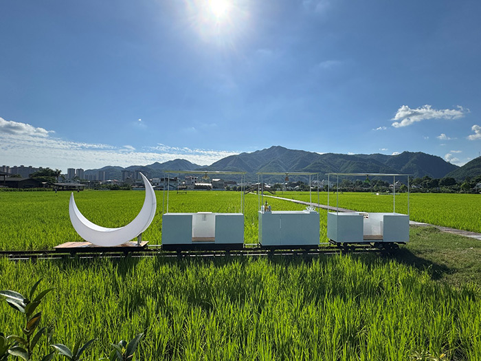 最先映入眼帘的,是稻田中的“小火车”。火车头被巧妙设计成一轮皎洁的“明月”,车厢则化身为精致的小型酒吧。游客可以坐在移动的吧台上,一边品尝以客家米酒调制的特色饮品“硒望”,一边与同伴畅谈欢笑。伴随着蒸汽与稻香,小火车缓缓驶过田间,带来一种独特的田园慢生活体验。