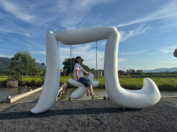 黄海波《汉字乐园》是一件互动性很强的作品,艺术家以汉字为设计元素,源自山区儿童诗歌,将“风、伞、大、林、人”等字的意象转化为互动设施,把孩子的想象变为可触的诗意体验,连接公益与文化温度。