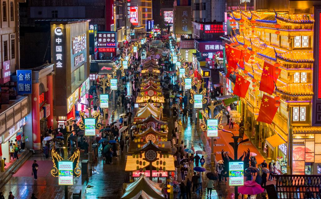 10月5日,游客在宁夏银川市鼓楼步行街游玩(无人机照片)。新华社记者 杨植森 摄