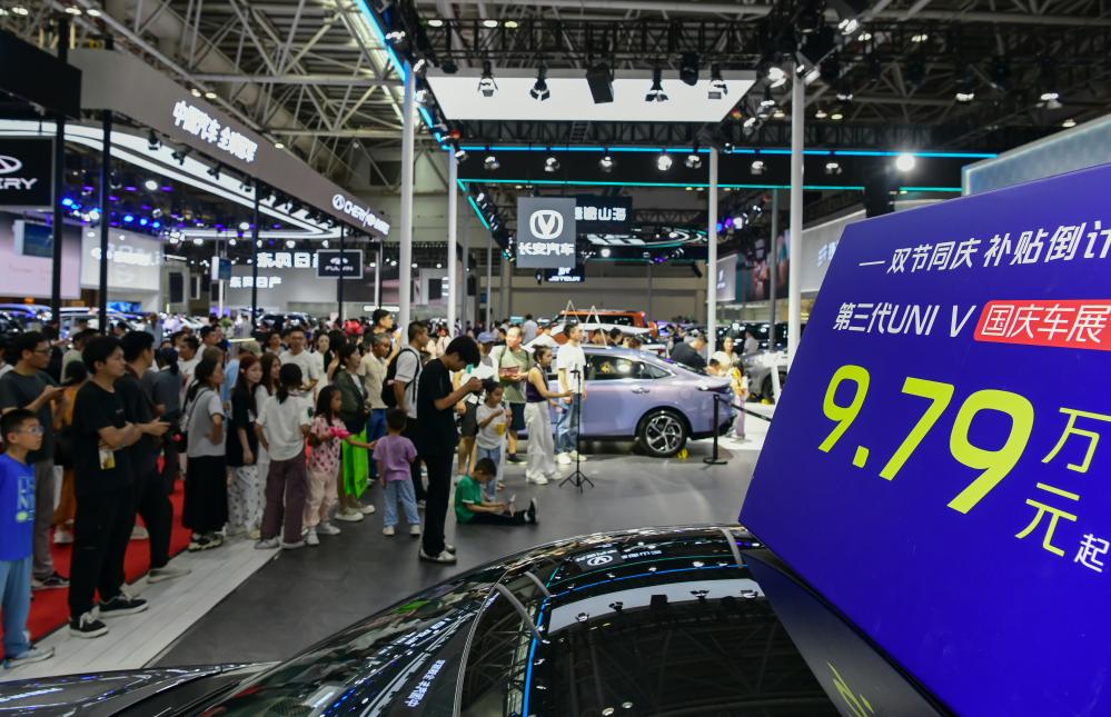 10月1日,市民在2025第46届中国(福州)国际汽车博览会现场观看车商的促销活动。新华社记者 魏培全 摄