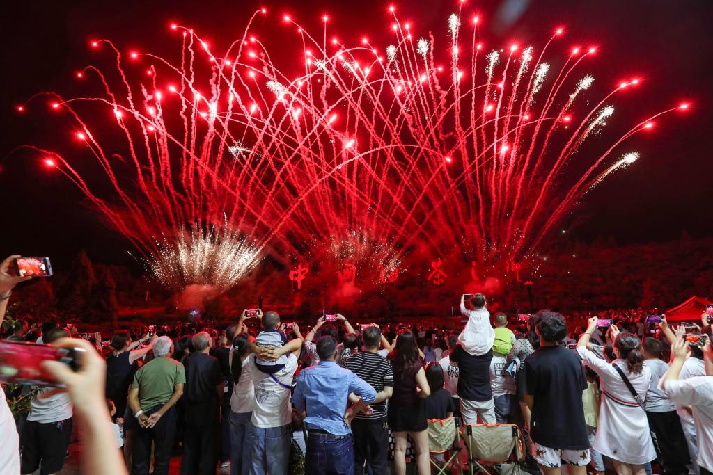 10月3日晚,游客在贵州省铜仁市玉屏侗族自治县茶花泉景区观看烟花。新华社发(胡攀学 摄)