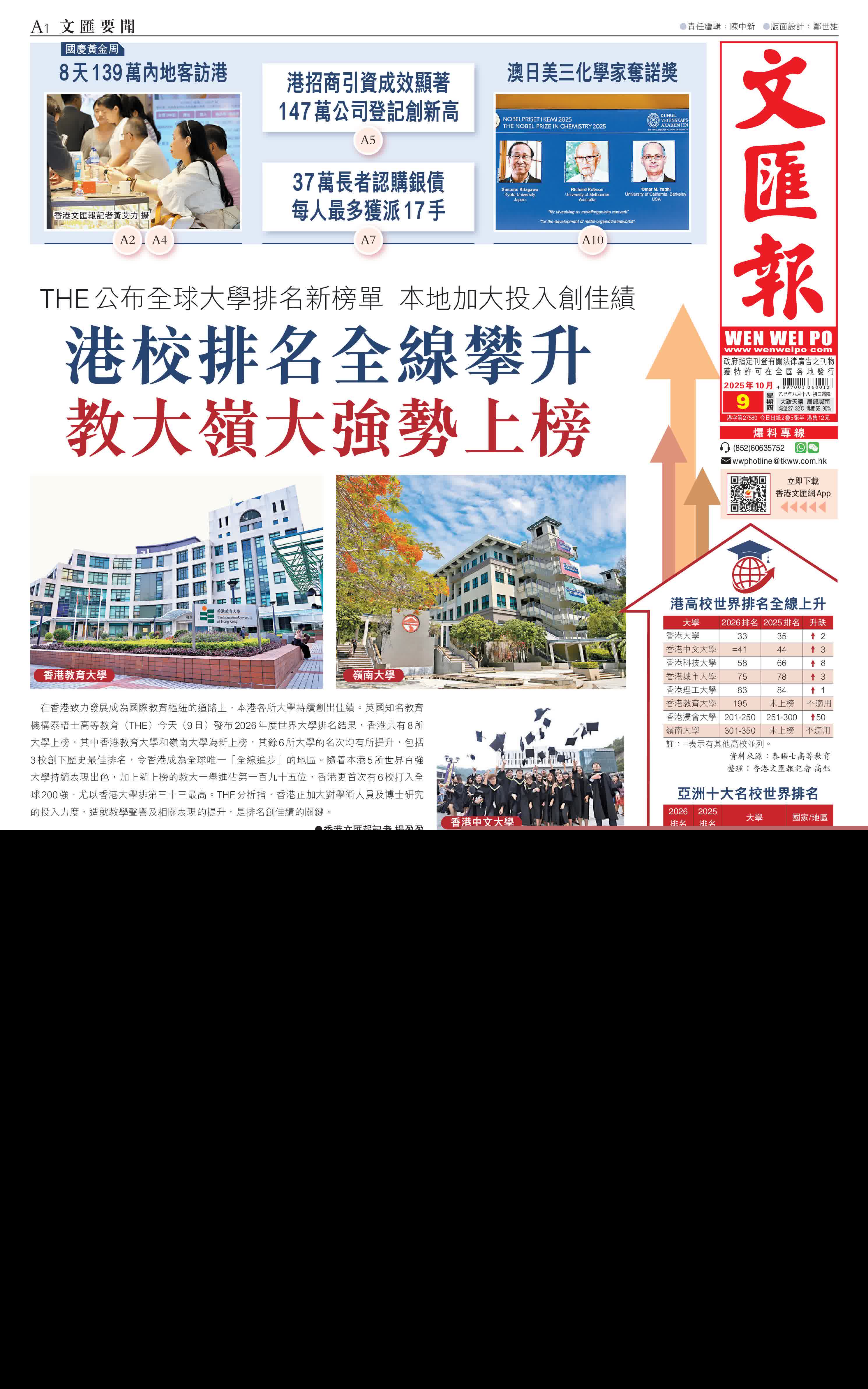 (香港文匯報記者 楊盈盈)在香港致力發展成為國際教育樞紐的道路上,本港各所大學持續創出佳績。英國知名教育機構泰晤士高等教育(THE)今天(9日)發布2026年度世界大學排名結果,香港共有8所大學上榜,其中香港教育大學和嶺南大學為新上榜,其餘6所大學的名次均有所提升,包括3校創下歷史最佳排名,令香港成為全球唯一「全線進步」的地區。隨着本港5所世界百強大學持續表現出色,加上新上榜的教大一舉進佔第一百九十五位,香港更首次有6校打入全球200強,尤以香港大學排第三十三最高。THE分析指,香港正加大對學術人員及博士研究的投入力度,造就教學聲譽及相關表現的提升,是排名創佳績的關鍵。