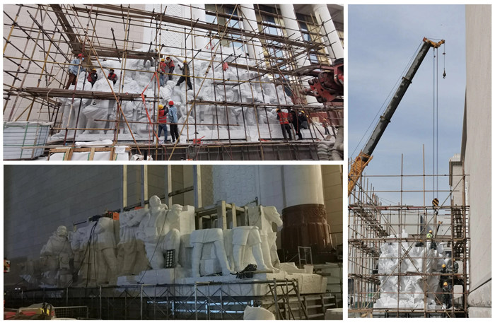 2021年,“建党100周年主题雕塑工程”主创团队在中国共产党历史展览馆广场施工现场。