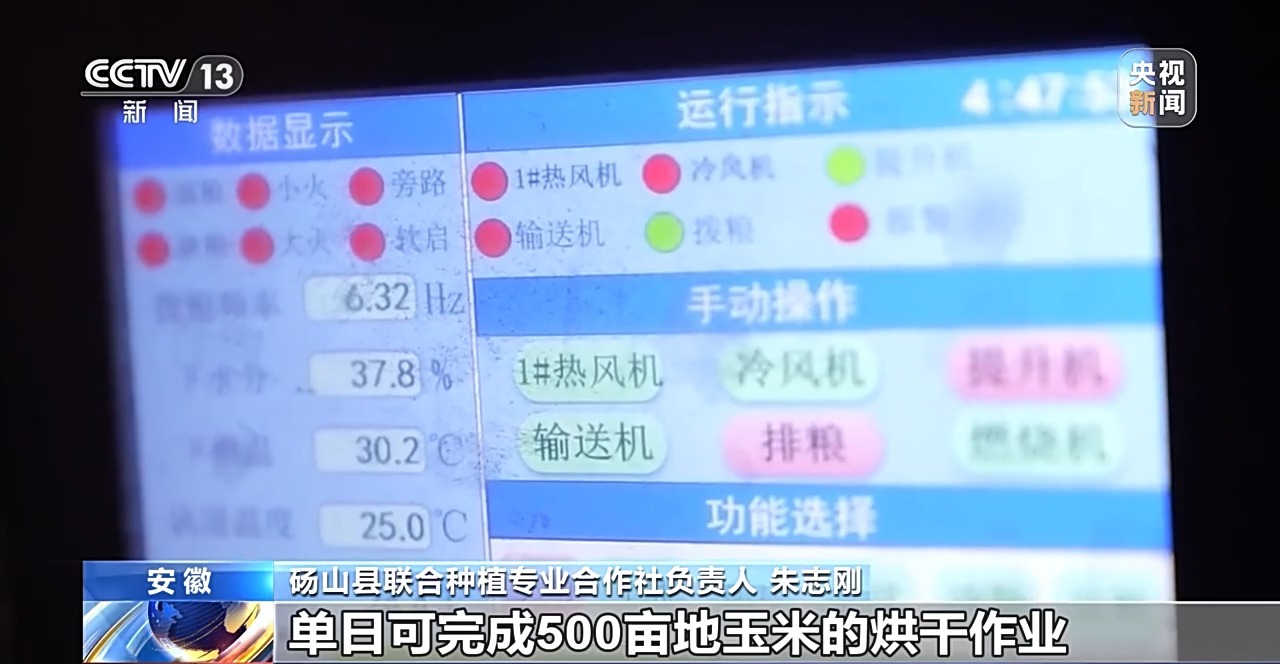 砀山县联合种植专业合作社负责人 朱志刚:目前,我们的湿玉米日处理能力已达到50余万斤,生产线24小时不间断运转,单日可完成500亩地玉米的烘干作业。
