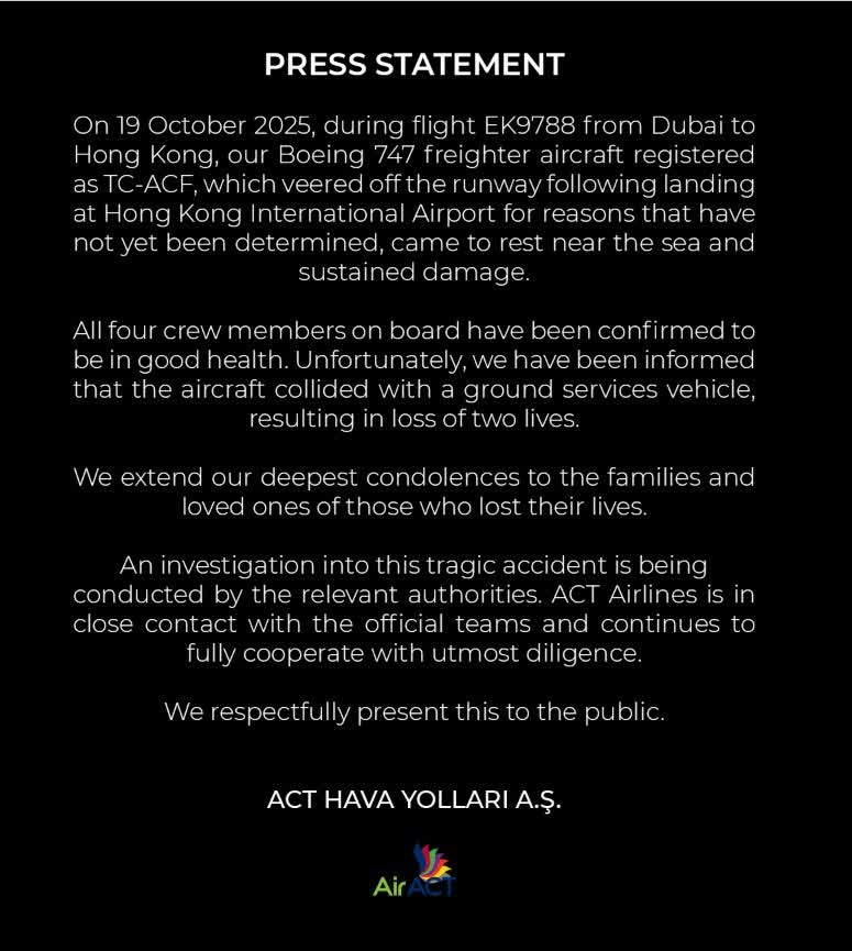 擁有肇事飛機的土耳其 ACT Airlines 發表聲明,表示對事故中兩名死者的家屬和親友,致以最深切哀悼和慰問,並會就事故調查與有關當局全力合作。相關部門正對今次事故展開調查,ACT Airlines 正與官方團隊保持密切聯繫,並繼續全力配合調查工作。