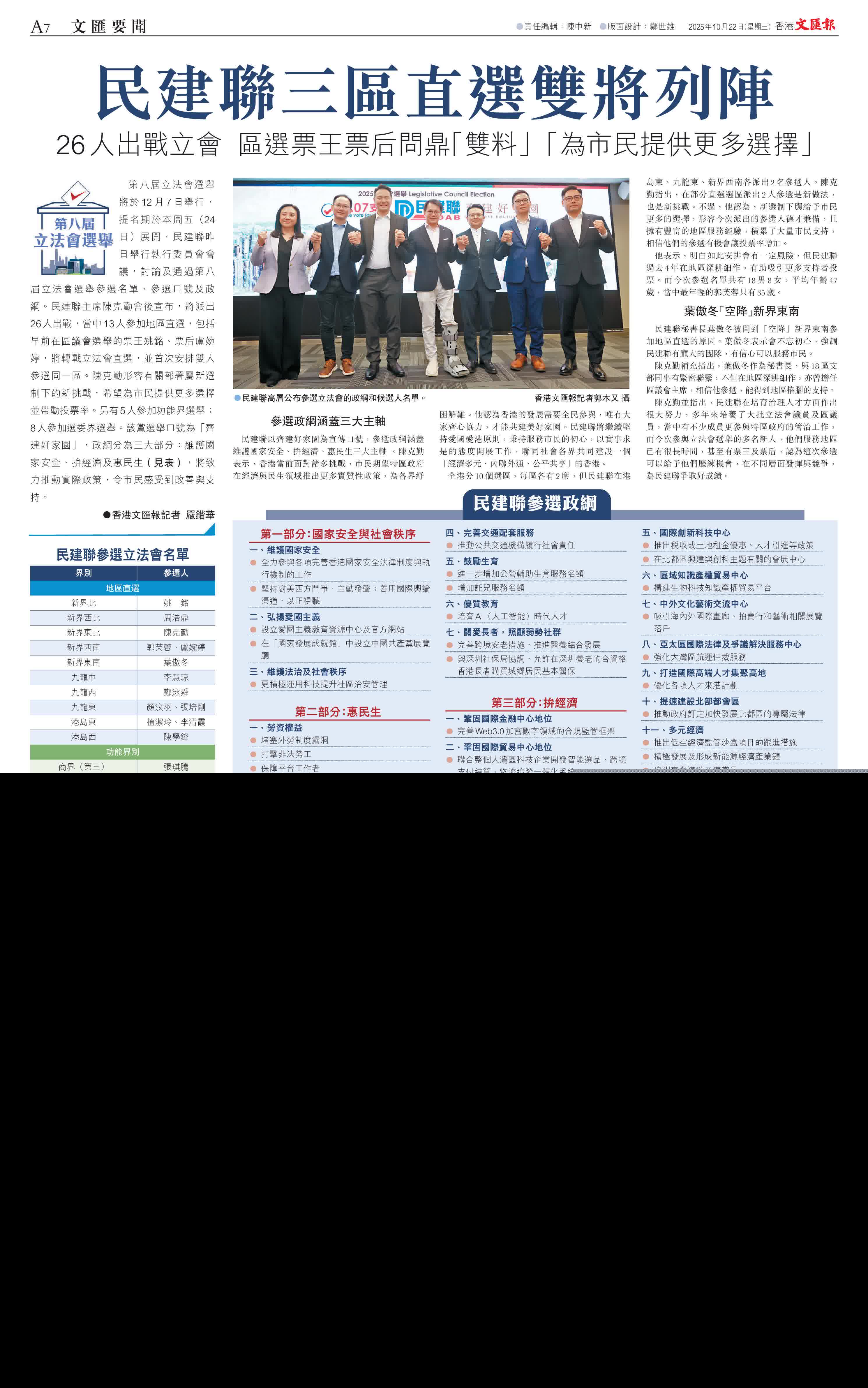 (香港文匯報記者 嚴鍇華)第八屆立法會選舉將於12月7日舉行,提名期於本周五(24日)展開,民建聯昨日舉行執行委員會會議,討論及通過第八屆立法會選舉參選名單、參選口號及政綱。民建聯主席陳克勤會後宣布,將派出26人出戰,當中13人參加地區直選,包括早前在區議會選舉的票王姚銘、票后盧婉婷,將轉戰立法會直選,並首次安排雙人參選同一區。陳克勤形容有關部署屬新選制下的新挑戰,希望為市民提供更多選擇並帶動投票率。另有5人參加功能界選舉;8人參加選委界選舉。該黨選舉口號為「齊建好家園」,政綱分為三大部分:維護國家安全、拚經濟及惠民生(見表),將致力推動實際政策,令市民感受到改善與支持。