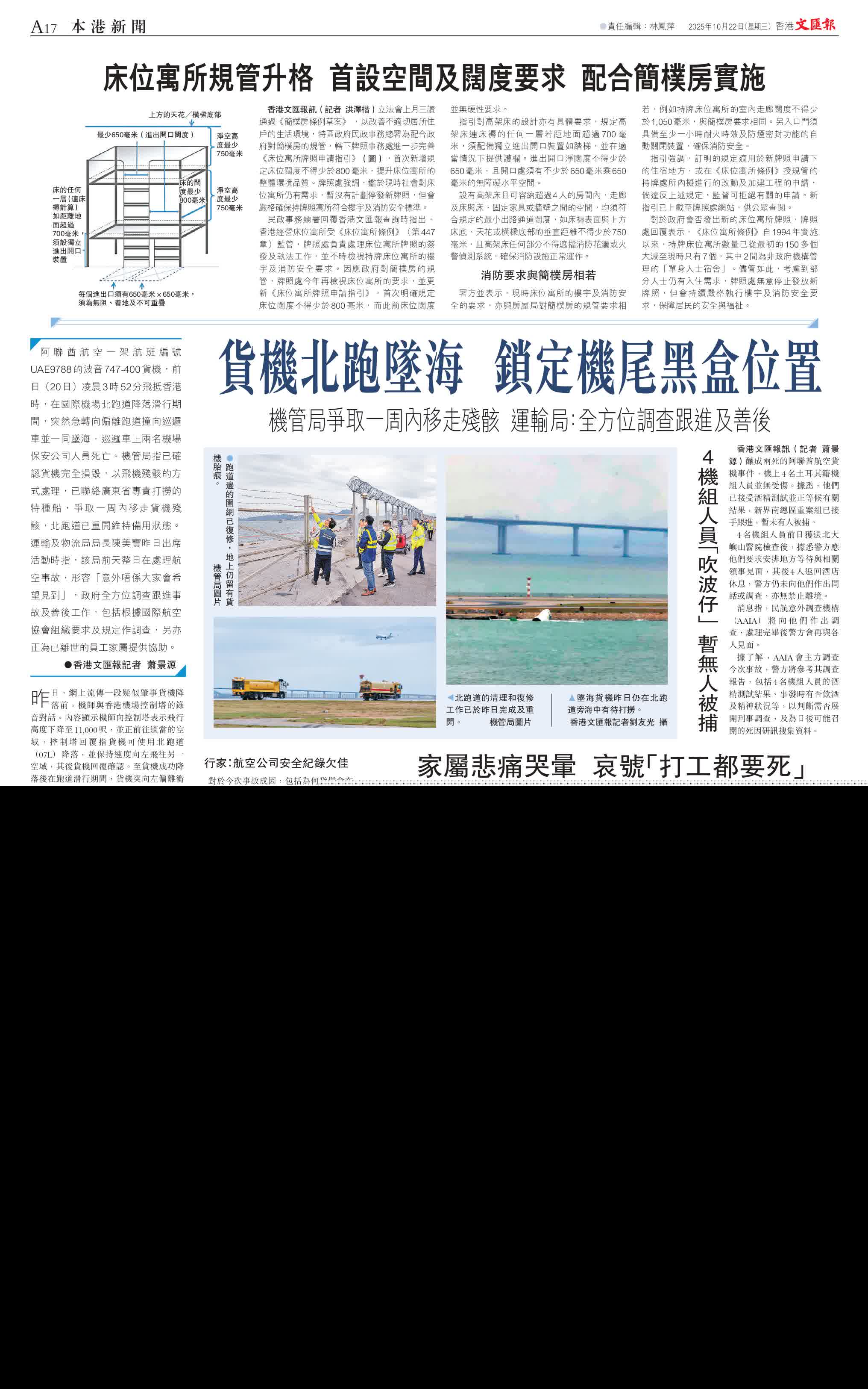 香港文匯報訊(記者 蕭景源)阿聯酋航空貨機衝出跑道墜海事故,被撞落海的地面巡邏車陳姓(30歲)航空安檢隊長,以及何姓(41歲)航空安檢督導罹難,遺下妻兒頓失所依。兩名死者的家屬共十多人,昨晨到葵涌殮房認屍,悲痛欲絕,痛斥航空公司至今仍未聯絡他們。當中陳的胞姐一度哀傷過度暈倒,哭喊指胞弟死得寃枉:「畀返個細佬我……嗚……打份工都要死……」要求航空公司還家人一個公道。