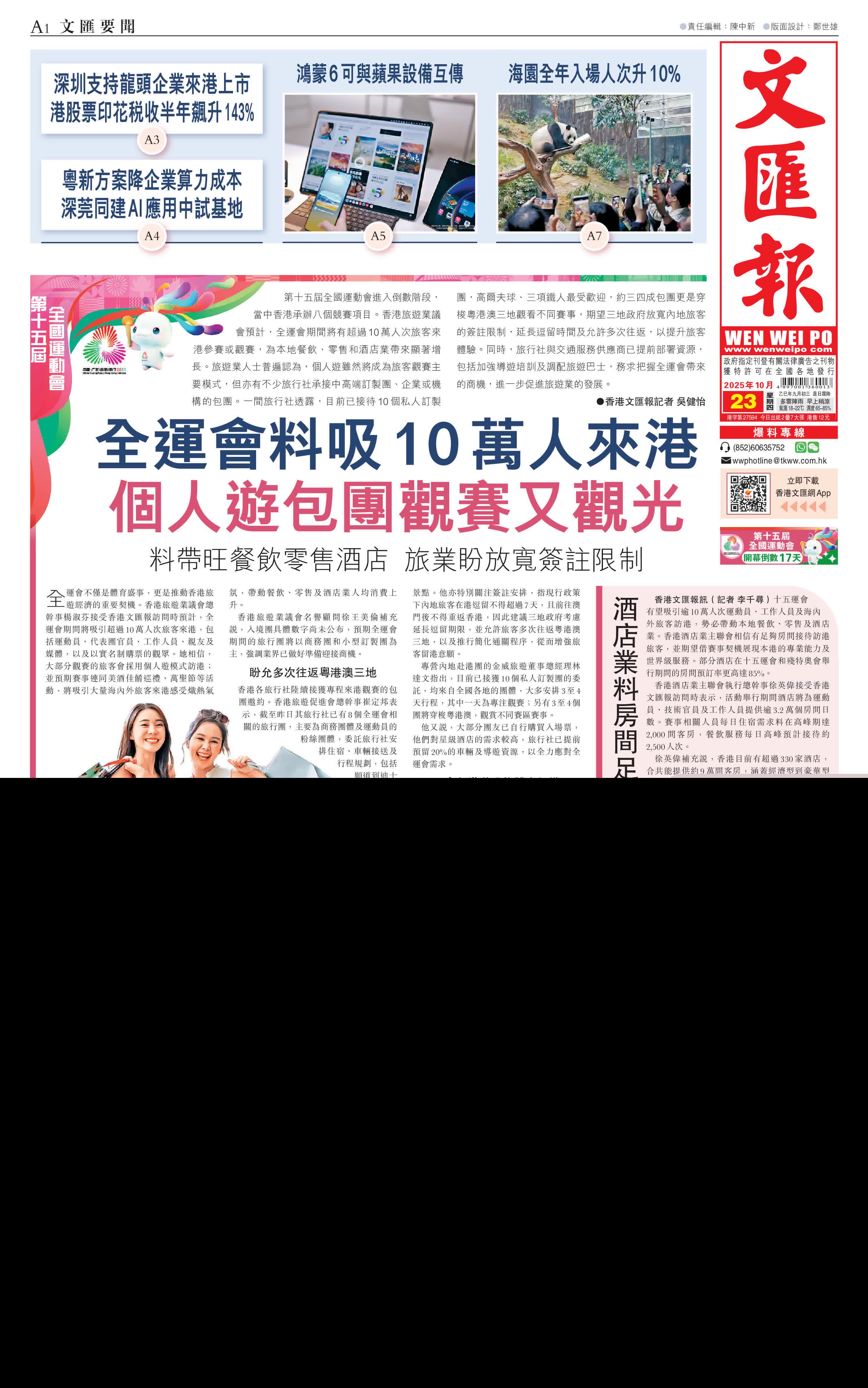 (香港文匯報記者 吳健怡)第十五屆全國運動會進入倒數階段,當中香港承辦八個競賽項目。香港旅遊業議會預計,全運會期間將有超過10萬人次旅客來港參賽或觀賽,為本地餐飲、零售和酒店業帶來顯著增長。旅遊業人士普遍認為,個人遊雖然將成為旅客觀賽主要模式,但亦有不少旅行社承接中高端訂製團、企業或機構的包團。一間旅行社透露,目前已接待10個私人訂製團,高爾夫球、三項鐵人最受歡迎,約三四成包團更是穿梭粵港澳三地觀看不同賽事,期望三地政府放寬內地旅客的簽註限制,延長逗留時間及允許多次往返,以提升旅客體驗。同時,旅行社與交通服務供應商已提前部署資源,包括加強導遊培訓及調配旅遊巴士,務求把握全運會帶來的商機,進一步促進旅遊業的發展。